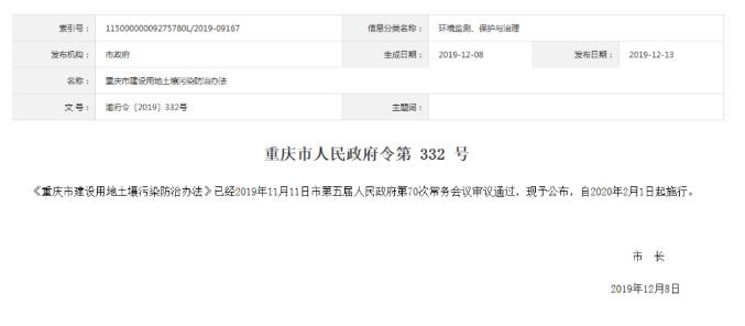 根據(jù)《中華人民共和國土壤污染防治法》、《重慶市環(huán)境保護(hù)條例》和有關(guān)法律法規(guī),結(jié)合重慶實(shí)際情況,2019年11月11日重慶市第五屆人民政府第70次常務(wù)會議審議通過了《重慶市建設(shè)用地土壤污染防治辦法》【重慶市人民政府令第 332 號】,該辦法已于2020年2月1日起正式施行。