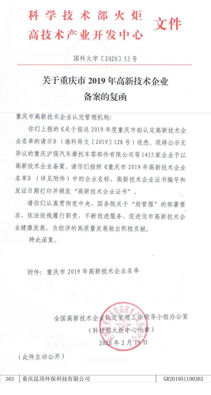 經(jīng)重慶市科技局初審、國(guó)家科技部復(fù)審,并根據(jù)國(guó)家《高新技術(shù)企業(yè)認(rèn)定管理辦法》和《高新技術(shù)企業(yè)認(rèn)定管理工作指引》的相關(guān)規(guī)定,重慶昆頂環(huán)??萍加邢薰颈徽J(rèn)定為“國(guó)家級(jí)高新技術(shù)企業(yè)”(GR201951100363)。 國(guó)家高新技術(shù)企業(yè)是指在國(guó)家重點(diǎn)支持的高新技術(shù)領(lǐng)域內(nèi),持續(xù)進(jìn)行研究開(kāi)發(fā)與技術(shù)成果轉(zhuǎn)化,形成企業(yè)核心自主知識(shí)產(chǎn)權(quán),并以此為基礎(chǔ)開(kāi)展經(jīng)營(yíng)活動(dòng)的企業(yè),屬于國(guó)內(nèi)領(lǐng)先或國(guó)際先進(jìn)的企業(yè)。 “國(guó)家高新技術(shù)企業(yè)”認(rèn)定,是由國(guó)務(wù)院頒布的認(rèn)證資質(zhì)和條件,并由財(cái)政部、科技部、稅務(wù)總局聯(lián)合負(fù)責(zé)認(rèn)定管理工作。該資質(zhì)對(duì)于企業(yè)核心技術(shù)的自主知識(shí)產(chǎn)權(quán)數(shù)量、研發(fā)團(tuán)隊(duì)、銷售與總資產(chǎn)成長(zhǎng)性、科技成果轉(zhuǎn)化力等各個(gè)方面都有極其嚴(yán)格的要求,我公司能最終獲得認(rèn)定,說(shuō)明公司在新一代環(huán)保技術(shù)創(chuàng)新研發(fā)方面得到國(guó)家的大力支持和認(rèn)可,同時(shí),積極推動(dòng)了公司自主創(chuàng)新、自主研發(fā)的進(jìn)程。
