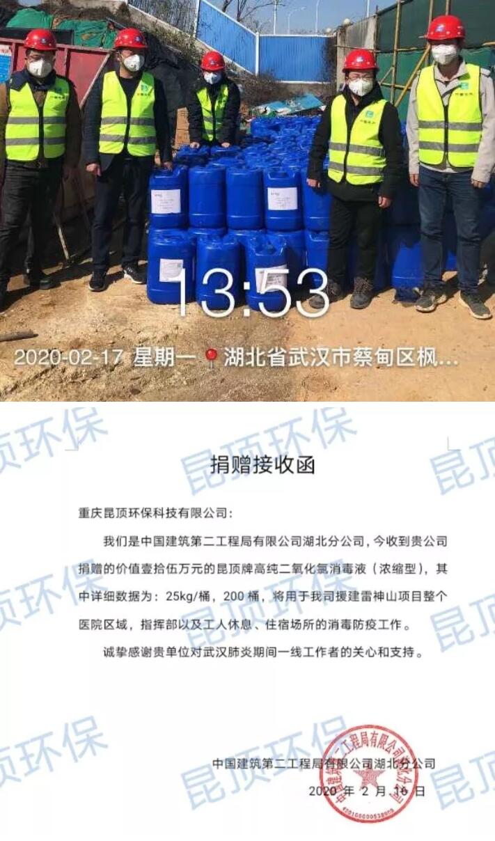 2月17日,昆頂環(huán)保向援建雷神山醫(yī)院的中國建筑第二工程局有限公司湖北分公司現(xiàn)場指揮部提供的消毒防疫物資,順利抵達(dá)武漢。這批物資為200桶高純二氧化氯消毒液,可稀釋成500噸消毒液對環(huán)境噴灑消毒,用于保障醫(yī)院區(qū)域、指揮部以及現(xiàn)場建設(shè)工作人員的疾病防控安全。